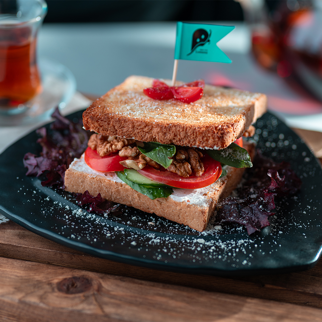 پنیر خامه‌ای،خیار،گوجه فرنگی،گردو،نان تست