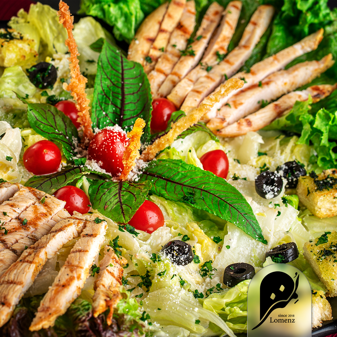 فیله مرغ گریل شده، کاهو، گوجه گیلاسی، نان تست ترد، پنیر پارمسان، سس مخصوص