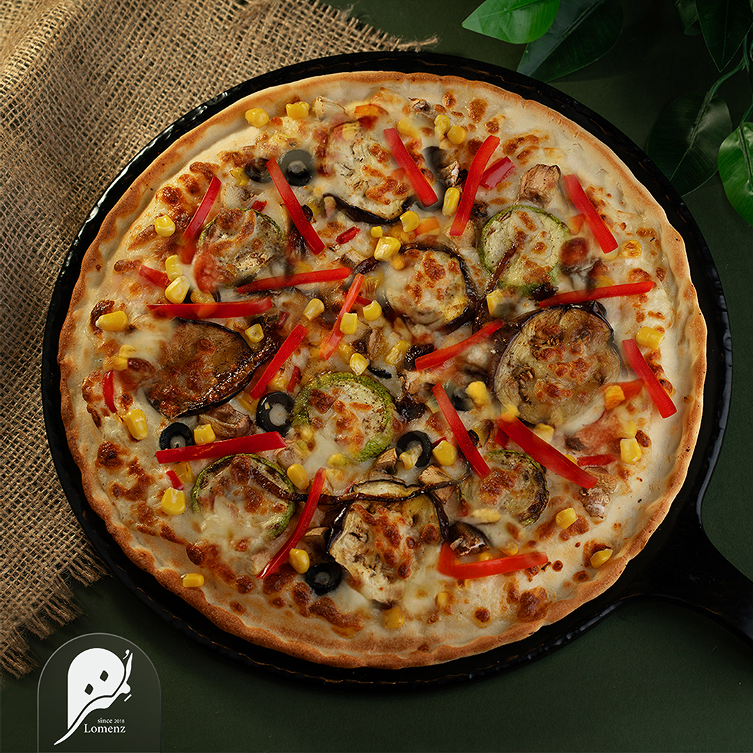 کدو، بادمجان، فلفل رنگی، قارچ، ذرت مکزیکی، زیتون سیاه اسلایس، خامه، پنیر موزارلا