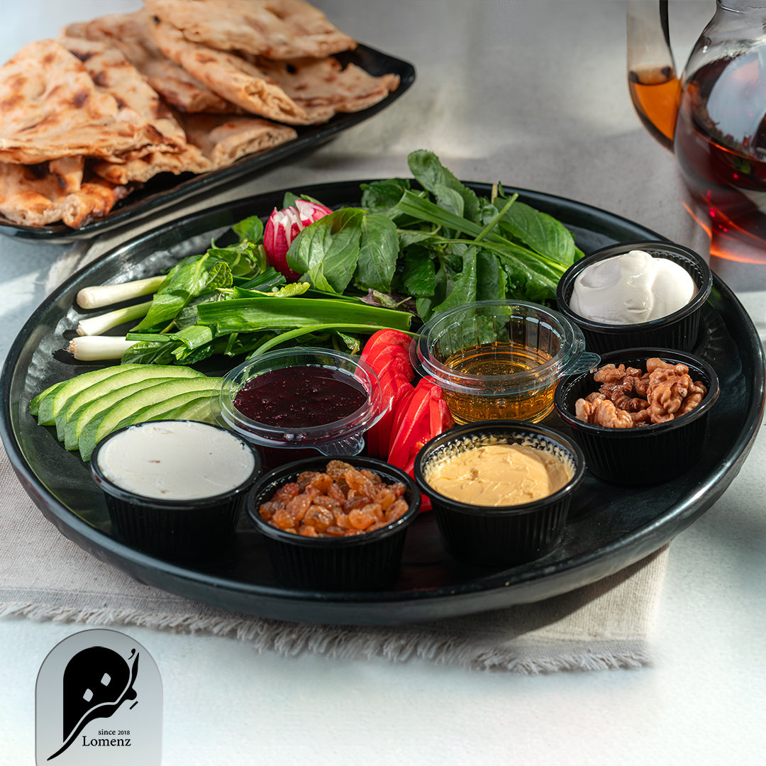 کره حیوانی،خامه،مربا،پنیر خامهای،عسل،کشمش،خیار،گوجه فرنگی،گردو،سبزی،نان سنگک