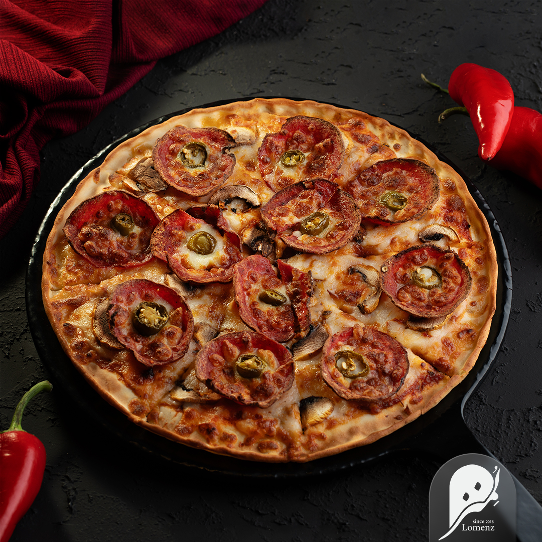پپرونی، قارچ، فلفل سبز، پنیر موزارلا