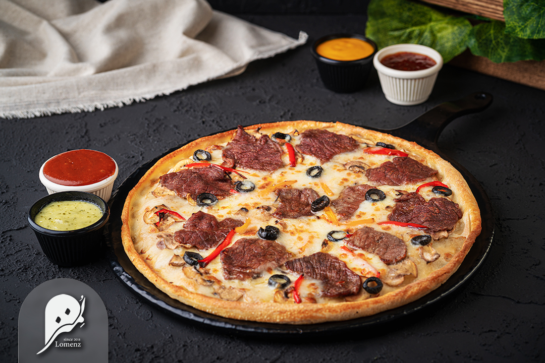 مرغ مرینیت شده، فیله گوساله، پنیر پیتزا، سس مخصوص، قارچ، زیتون سیاه اسلایس ، فلفل دلمه رنگی