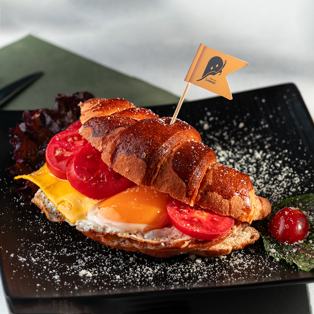 نان کروسان،سینه بوقلمون،تخم مرغ،گوجه